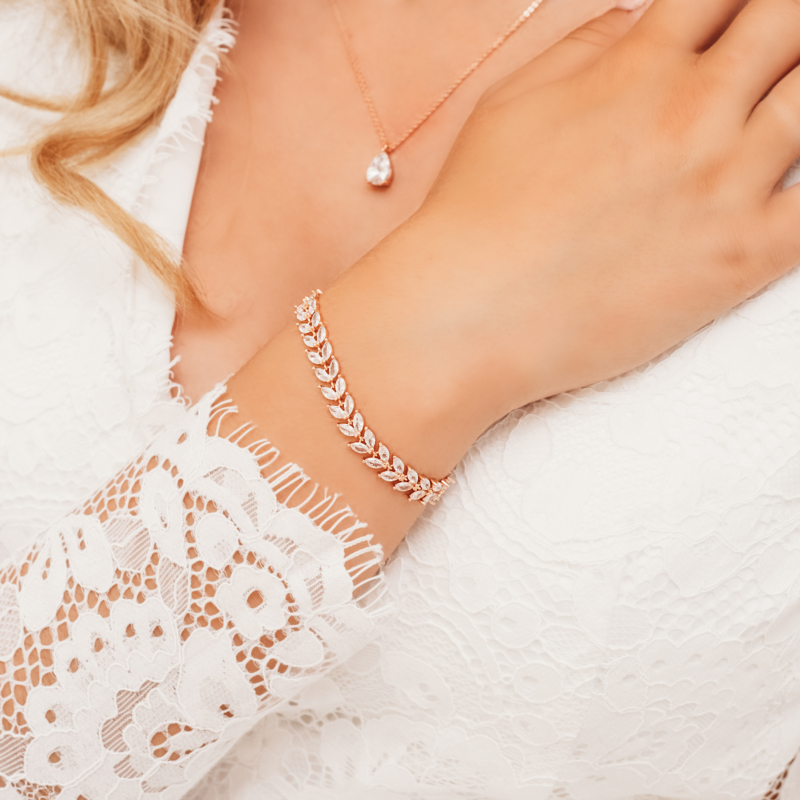 Met deze bridal sieradenset in de kleur rosé goud ben jij gegarandeerd het stralende middelpunt tijdens jullie grote dag! Wij hebben de set met veel liefde en zorg voor jou samengesteld, zodat je zeker weet dat jouw bruidssieraden perfect bij elkaar passen. Na jouw bruiloft kun je de sieraden natuurlijk ook nog los van elkaar dragen, bijvoorbeeld voor een speciale gelegenheid! Alles wat je verder nog moet weten over deze bridal sieradenset in de kleur rosé goud: