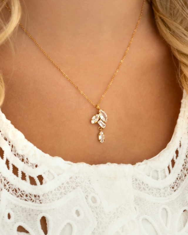 Hoe mooi is deze bruids ketting met luxe steentjes in de kleur goud? Wij zijn echt verliefd! Deze ketting is niet alleen perfect om op jouw bruiloft te dragen, maar ook naar iedere andere speciale gelegenheid. De perfecte sparkle om jouw look net wat extra’s te geven. Heb jij de bijpassende armband en oorbellen ook gespot? Zo mooi om samen te dragen! Je ontvangt de ketting in een luxe DRKS sieradendoosje waarin je gratis een persoonlijke tekst kunt laten printen. Hoe leuk is dat? Alles wat je verder nog moet weten over deze goudkleurige bruids ketting met luxe steentjes: