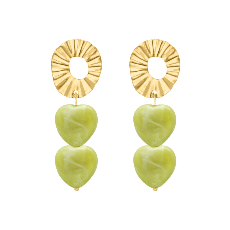 Hoe leuk zijn deze dubbele hartjes oorbellen groen goudkleurig? De combinatie van de mooie groene tint met het goudkleurige detail zorgt voor een kleurrijke, speelse en trendy uitstraling. Welke outfit je ook kiest, deze oorbellen maken je look meteen compleet. De groene kleur combineert supermooi met het goud. En extra fijn: ze zijn gemaakt van stainless steel, dus ze verkleuren niet! Ideaal voor elke dag, maar ook heel leuk voor een etentje of feestje. Dit zijn van die oorbellen die je er steeds weer bij pakt: cute, stijlvol en gewoon zó leuk! Alle details op een rijtje: