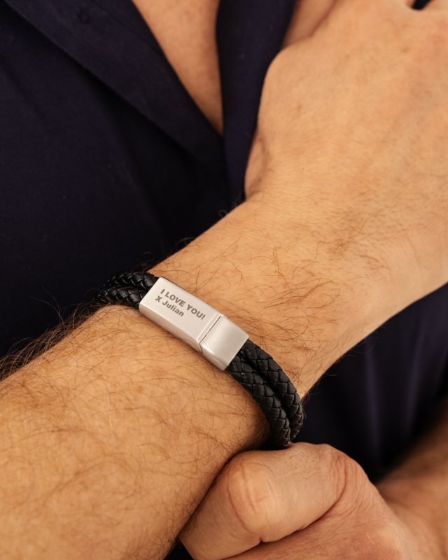 Op zoek naar een cadeau voor hem? Met deze dubbele leren heren armband verras je elke man! We graveren de heren armband gratis naar keuze en je ontvangt de leren heren armband in een mooi DRKS sieradendoosje met gratis persoonlijke tekst. Combineer met manchetknopen met initialen en maak zijn trendy look compleet! Alle details van de dubbele leren heren armband vind je hieronder: