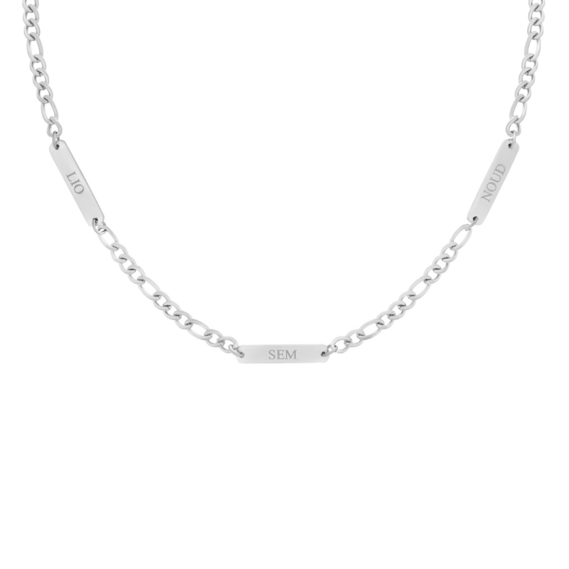 Sommige sieraden draag je niet alleen voor de look, maar ook voor wat ze betekenen! Deze graveerbare ketting met namen in zilverkleur is zo’n item. Met de graveerbare plaatjes geef je eenvoudig een persoonlijke twist aan deze schakelketting. Je kiest namelijk zelf of je de ketting met 1, 2, 3 of 4 plaatjes wilt ontvangen en laat plaatje afzonderlijk graveren. Van namen die je dierbaar zijn tot datums die je nooit wilt vergeten; deze ketting ontwerp je helemaal naar wens! De combinatie van de strakke schakels en de mooie zilverkleur maakt de ketting modern en moeiteloos draagbaar. En dankzij het gebruik van stainless steel blijft hij mooi, ook bij dagelijks dragen. Alle details op een rijtje: