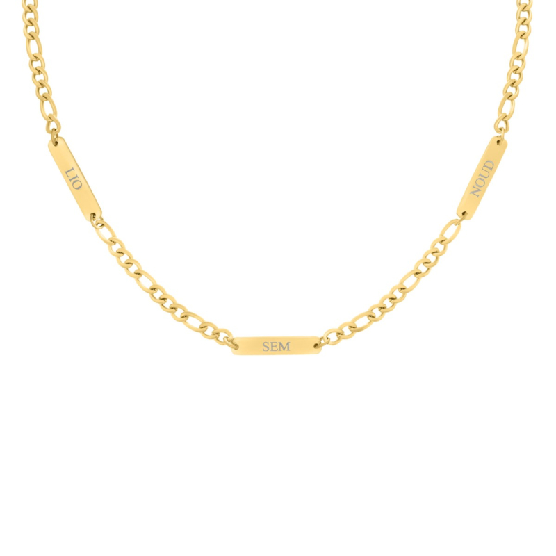 Met deze goudkleurige graveerbare ketting met namen draag je jouw eigen verhaal! Een sieraad dat niet alleen mooi is om te zien, maar ook een persoonlijke betekenis krijgt. Je kiest namelijk zelf of je de ketting met 1, 2, 3 of 4 plaatjes wilt ontvangen én laat elk plaatje naar keuze graveren. Kies voor de namen van mensen die belangrijk voor je zijn, hun initialen of een speciale datum. Met deze ketting creëer je een uniek en persoonlijk ontwerp dat je elke dag bij je draagt. De ketting heeft een stijlvolle, tijdloze uitstraling en past moeiteloos bij iedere look! Van casual tot chic. Alles wat je verder nog moet weten over de graveerbare schakelketting met namen goudkleurig: