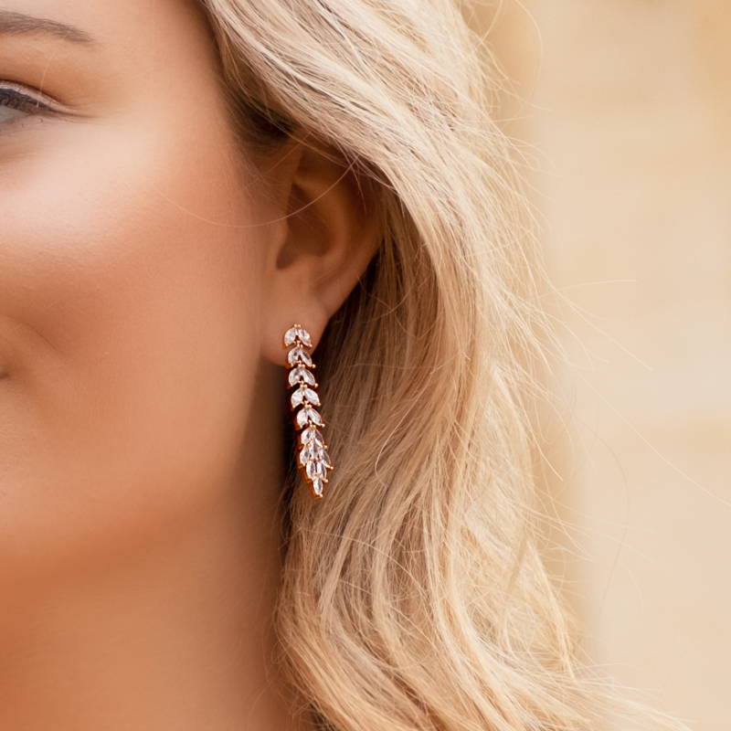 Say YES to your bridal earrings! Ben jij nog op zoek naar een paar bruids oorbellen om jouw bruidslook helemaal compleet te maken? Deze rose vergulde bruids oorbellen zijn de juiste keuze wanneer je graag rosé goud kleurige sieraden wilt dragen op jouw bruiloft! De lange bruids oorbellen glinsteren super mooi en geven jou een prachtige sparkle op jullie grote dag. Match de oorbellen met een bijpassende ketting of armband en jouw sieradenset is compleet! Je ontvangt de lange bruids oorbellen in een sieradendoosje van DKRS dat je eventueel naar wens kunt laten personaliseren door er een persoonlijke tekst in te laten printen. Hieronder vind je alle details van deze rose vergulde bruids oorbellen: