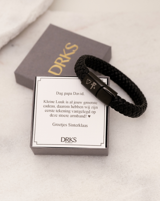 Onze bestseller zwarte leren heren armband is er nu in een nieuwe variant! Je kunt nu deze musthave shoppen met eigen handschrift of tekening! Ga je voor een tekst in jouw eigen handschrift of laat je jouw little loved one een schattige tekening maken? Het perfecte cadeautje voor hem! Alle details vind je hieronder: