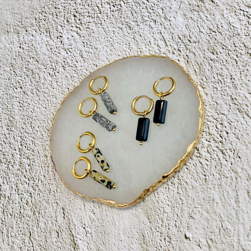 - Materiaal: nikkelvrij, een natuursteentje en verguld stainless steel;