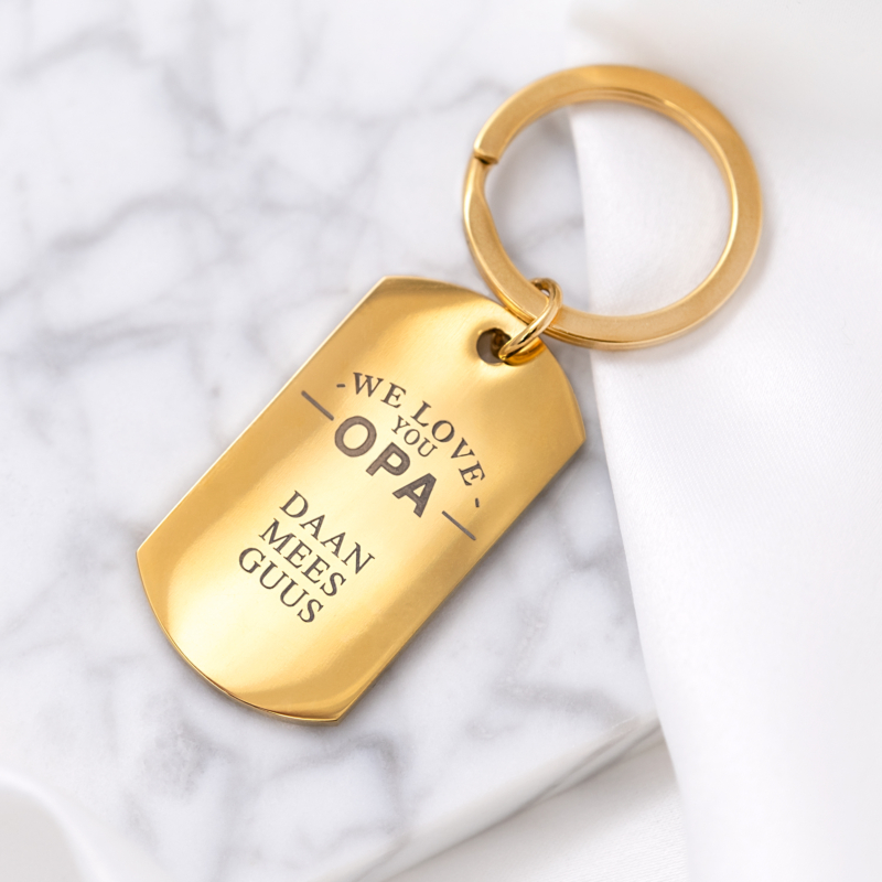 Deze sleutelhanger met naam in de kleur goud is een super leuk cadeau voor jouw opa! Wij graveren de tekst ‘We love you opa’ al voor jou in de sleutelhanger. Het enige wat jij nog hoeft te doen, is de namen invullen die jij graag eronder wil hebben! Super leuk om aan jouw opa te geven, zodat hij altijd een herinnering heeft aan hoeveel zijn kleinkinderen van hem houden! Je ontvangt deze naam sleutelhanger in een DRKS doosje, super leuk om cadeau te doen natuurlijk! Alle info over deze goud kleurige sleutelhanger met naam vind je hier: