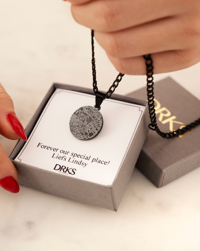 Kan jij het je nog herinneren? De plek waar jij je grote liefde hebt leren kennen? Deze speciale plek laat je nu gratis graveren in deze zwarte where we met heren ketting! Vul ‘jullie’ plaats in en deze verschijnt met een hartje op de kaart. Je kunt de locatie zelf nog wat verder in of uitzoomen. Zo kies je helemaal zelf welk gedeelte van de kaart we gaan graveren in deze heren ketting! Zo’n uniek cadeau heb je hem nog niet eerder gegeven! Dit zijn alle details van de where we met heren ketting in de kleur zwart: